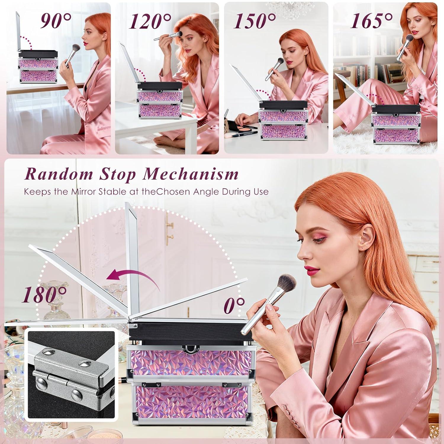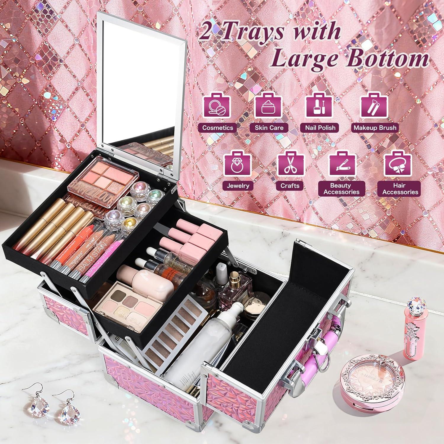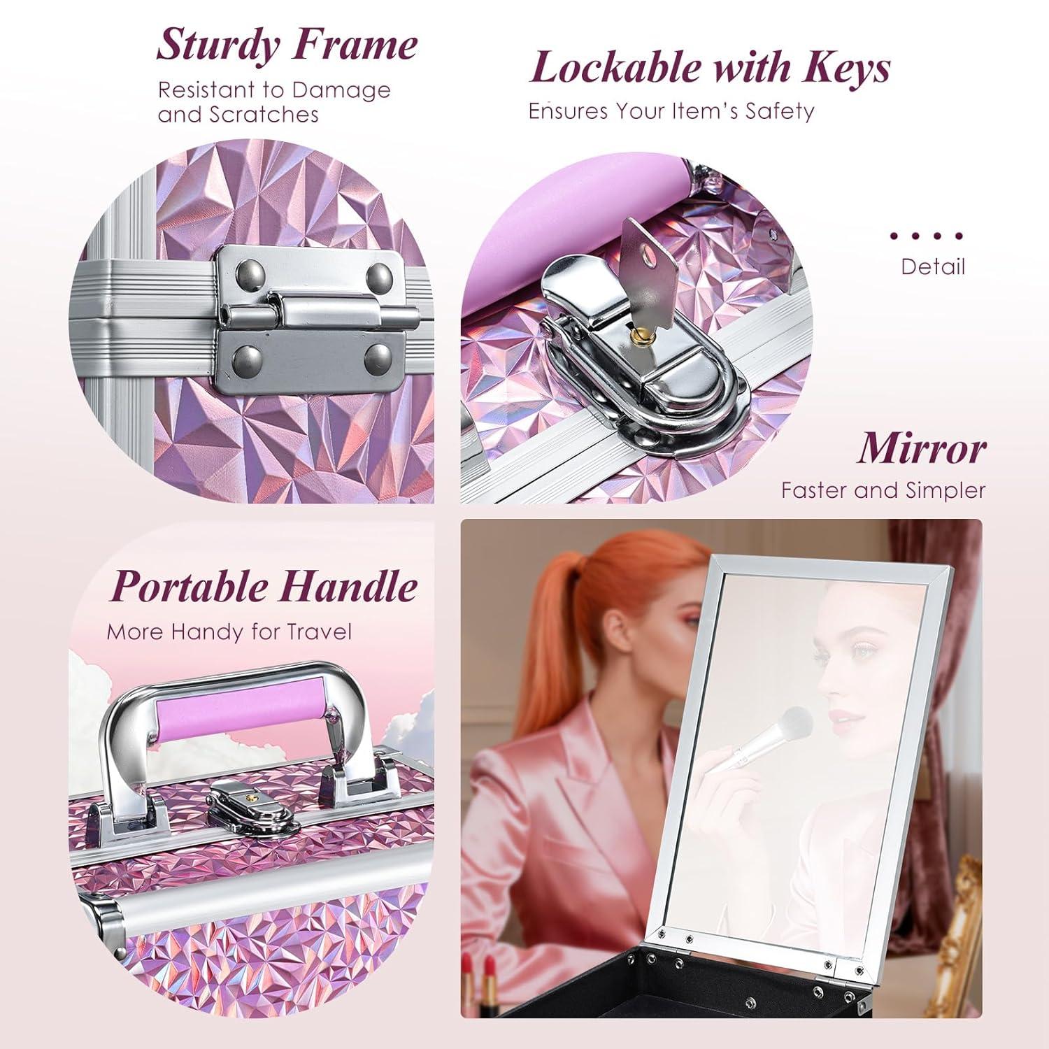imageFRENESSA Makeup Case Organizer Cosmetic Box Storage Portable Makeup Train Case with Mirror 2 Trays Travel Vanity Box for Cosmetics Nail Kits Craft Tools Case Aluminum Hard Make Up Organizer BlackShiny Pink