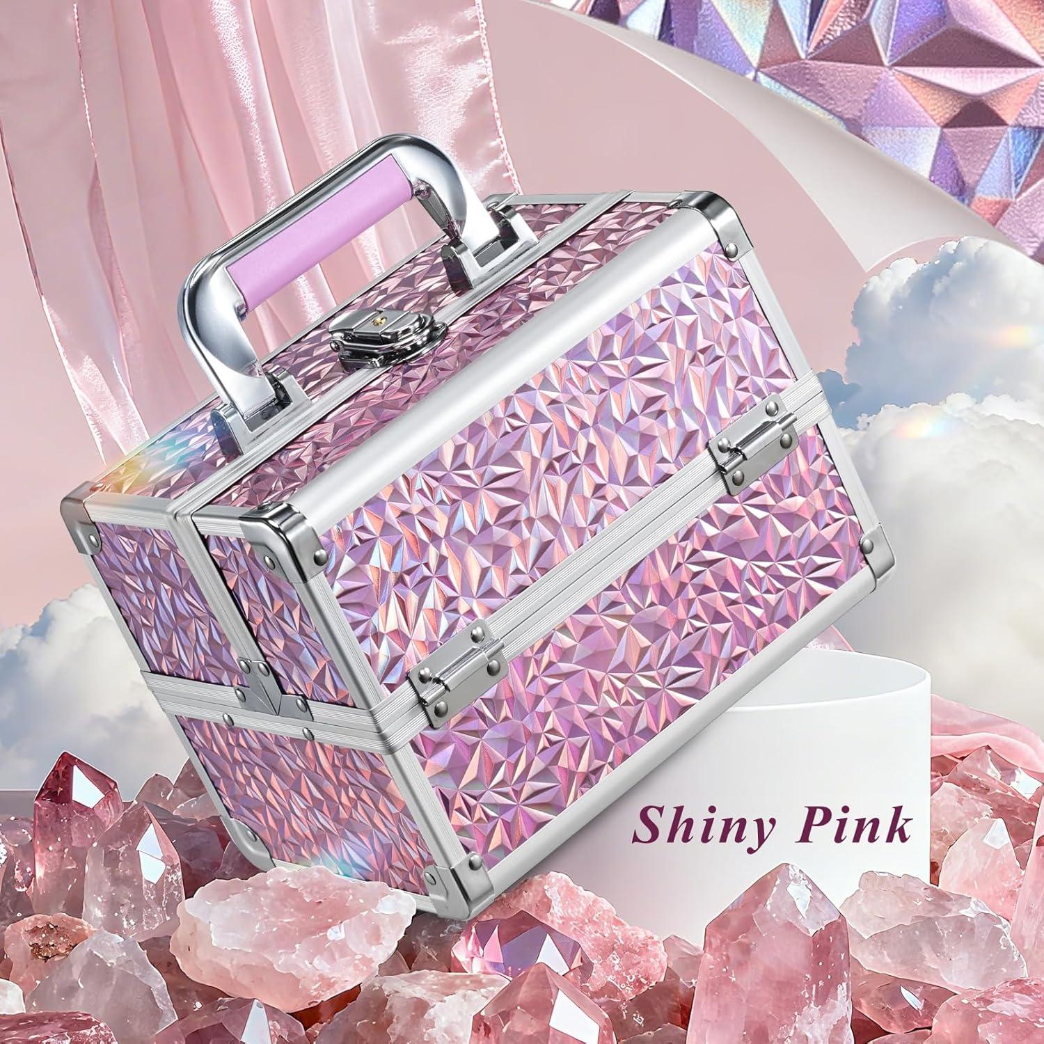 FRENESSA Makeup Case Organizer Cosmetic Box Storage Portable Makeup Train Case with Mirror 2 Trays Travel Vanity Box for Cosmetics Nail Kits Craft Tools Case Aluminum Hard Make Up Organizer Black(Shiny Pink)