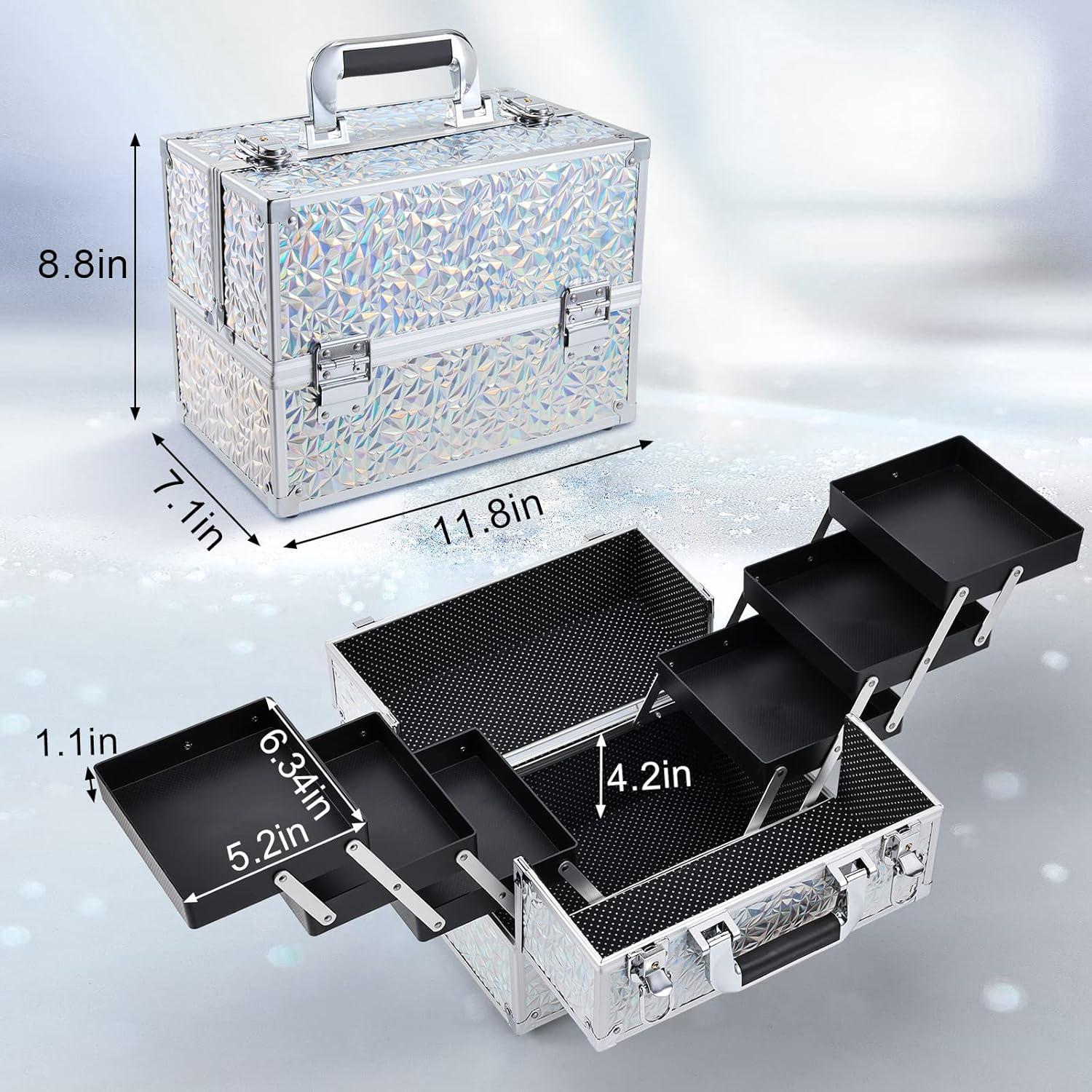 “Hard Large Makeup Case: Measuring 11.8 x 7.1 x 8.8 inches. This sturdy black makeup case organizes and carries cosmetics effortlessly. Its portable size suits travel and daily use for all skill levels. Durable ABS aluminum construction with metal reinforced corners protects contents from impact, extending lifespan. Lightweight yet exceptionally durable, this case balances portability and lasting performance for on-the-go use.