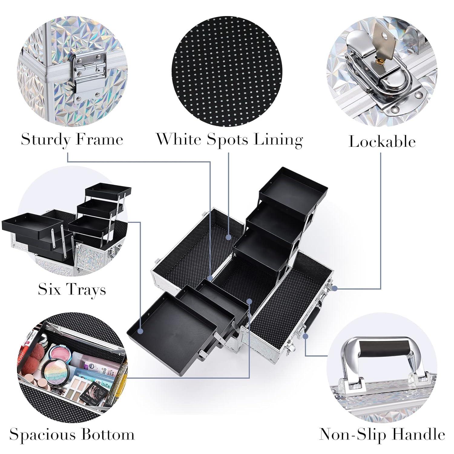 Makeup Train Case with 6 Trays: The extendable cantilever tray with six tiers offers a spacious and practical storage solution, featuring a roomy bottom area for all your essentials. The design is enhanced by unique white spots, making it a perfect gift for women and girls who value function and style. Its flexible storage options accommodate various cosmetics, from daily toiletries to nail polishes, essential oils, jewelry, paintbrushes, and crafting tools. The bottom space is ideal for palettes and travel-size bottles, keeping everything organized and easily accessible.