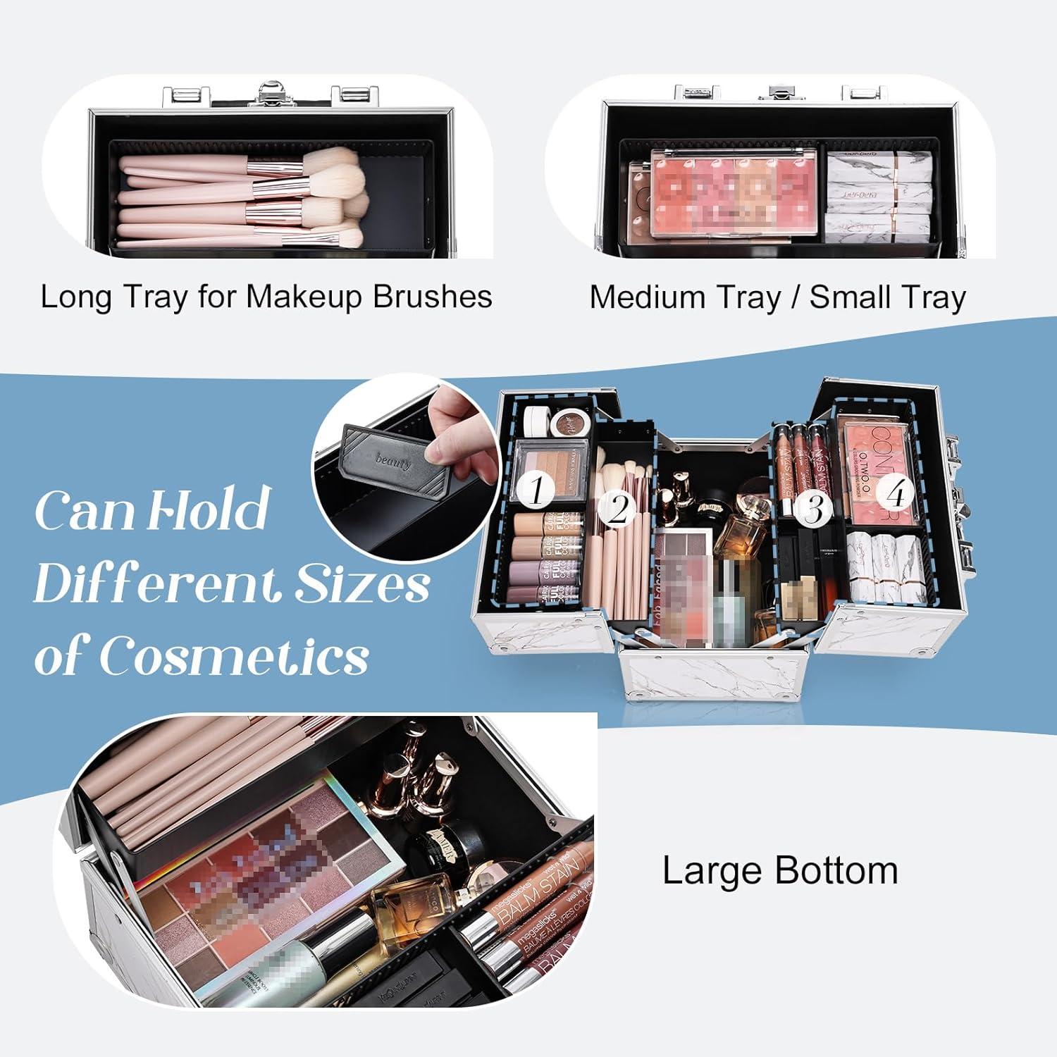 Versatile Makeup Box: This train case efficiently organizes all your beauty products. Its extendable 4-tier cantilever trays maximize space and access. 4 movable partitions to secure items during transport. Customize the compartments for different-sized items, keeping them organized and protected from damage. A spacious bottom compartment stores larger items like brushes, palettes, and lipstick collections, ensuring everything is secure and accessible.