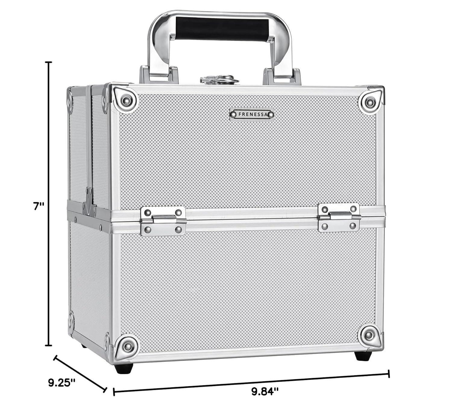 Hard Makeup Case: This sturdy silver makeup case organizes and carries cosmetics effortlessly. Its portable 9.84″x7.08″x9.33″ size suits travel and daily use for all skill levels. Durable ABS aluminum construction with metal reinforced corners protects contents from impact, extending lifespan. Lightweight yet exceptionally durable, this case balances portability and lasting performance for on-the-go use.