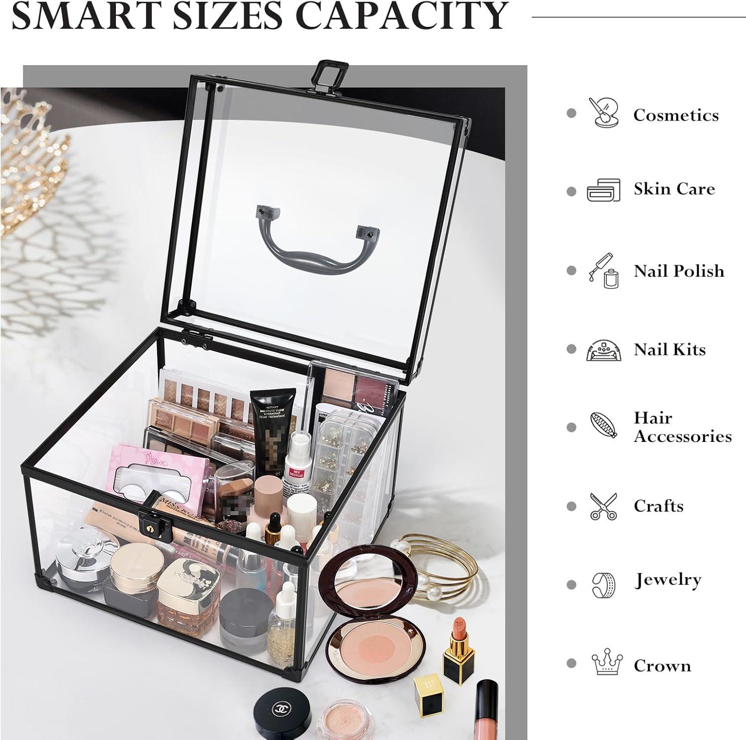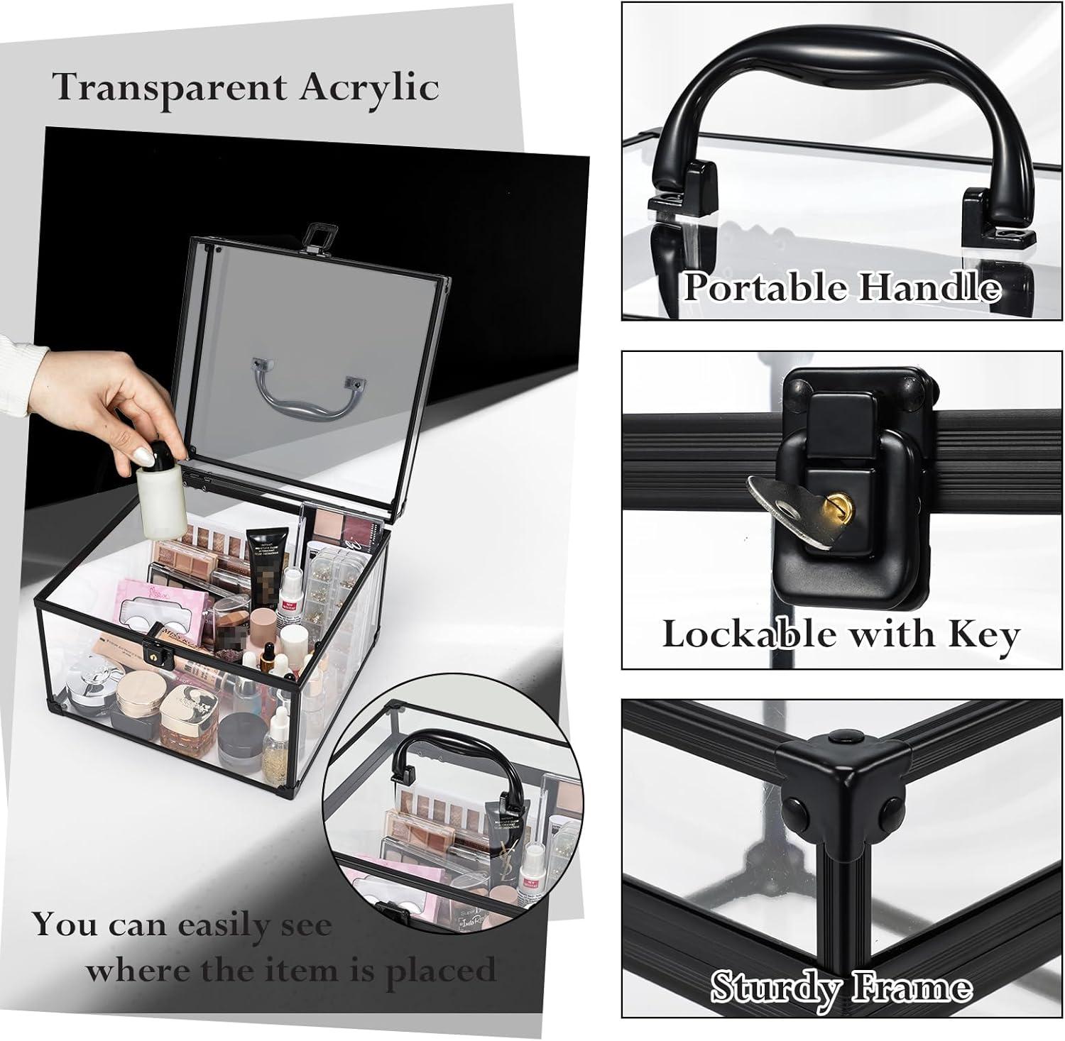 【High-quality Acrylic Material】: This makeup box is crafted from high-quality transparent acrylic and durable alloy, ensuring long-lasting durability. The transparent exterior allows for easy visibility and quick access to essentials, making it particularly convenient for travelers. Reinforced corners and hinges further enhance its strength and sturdiness.