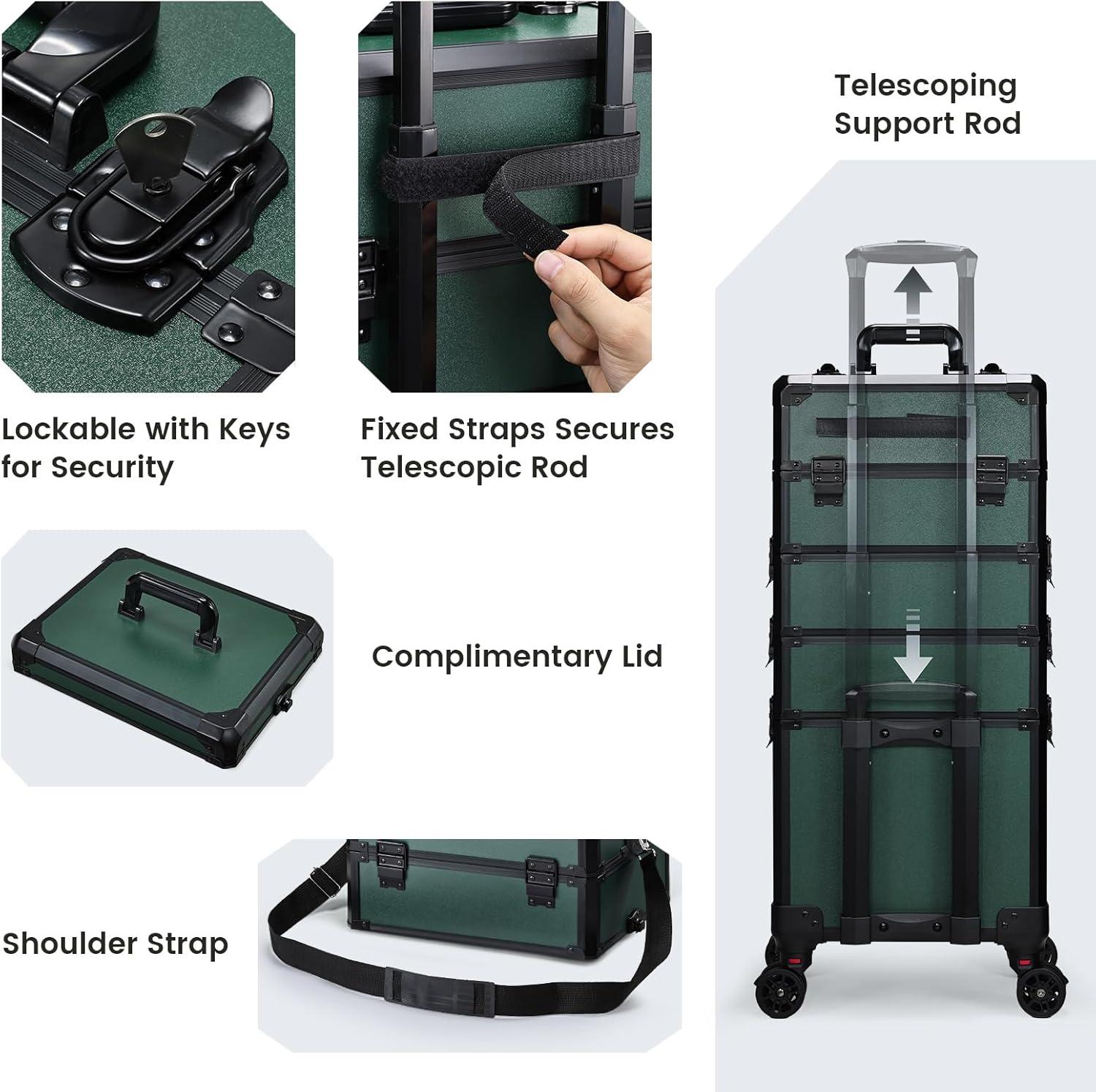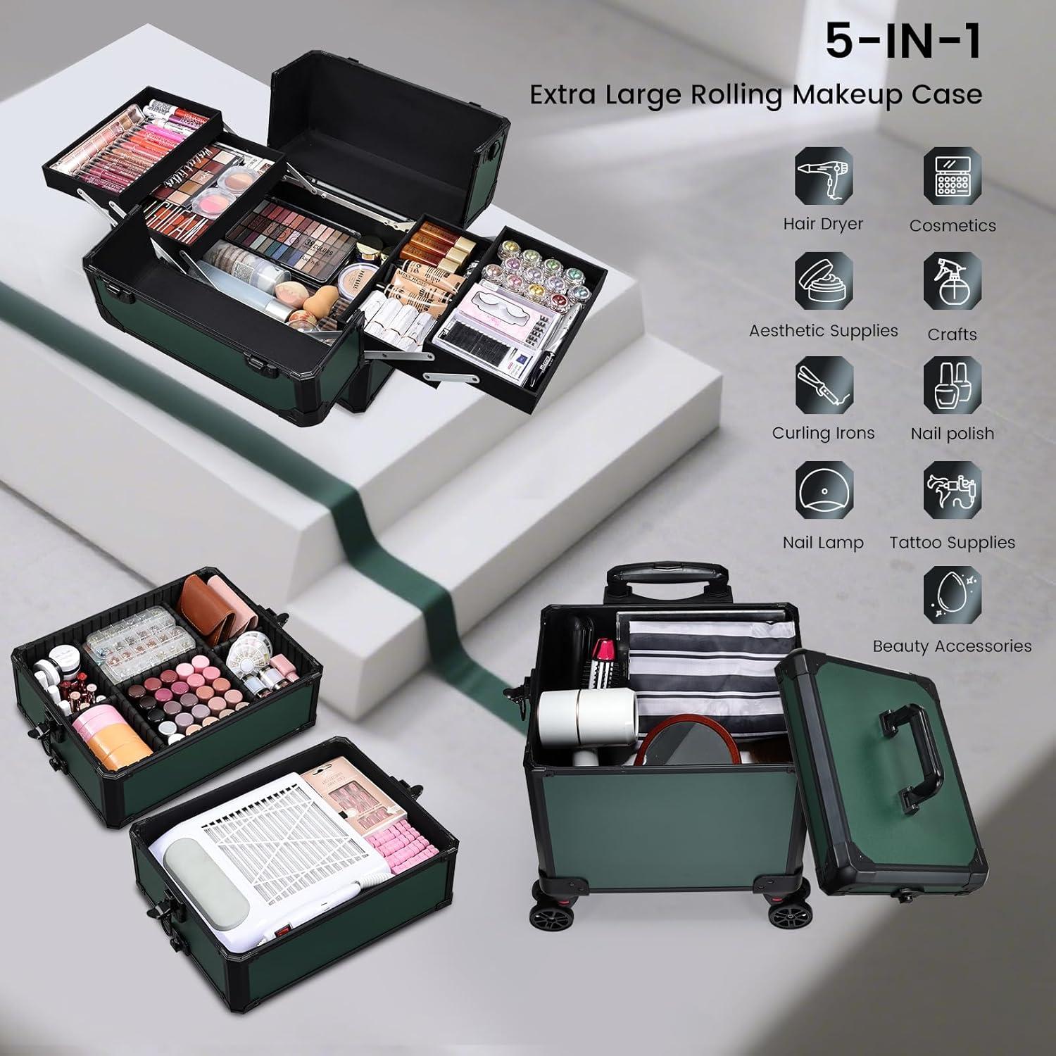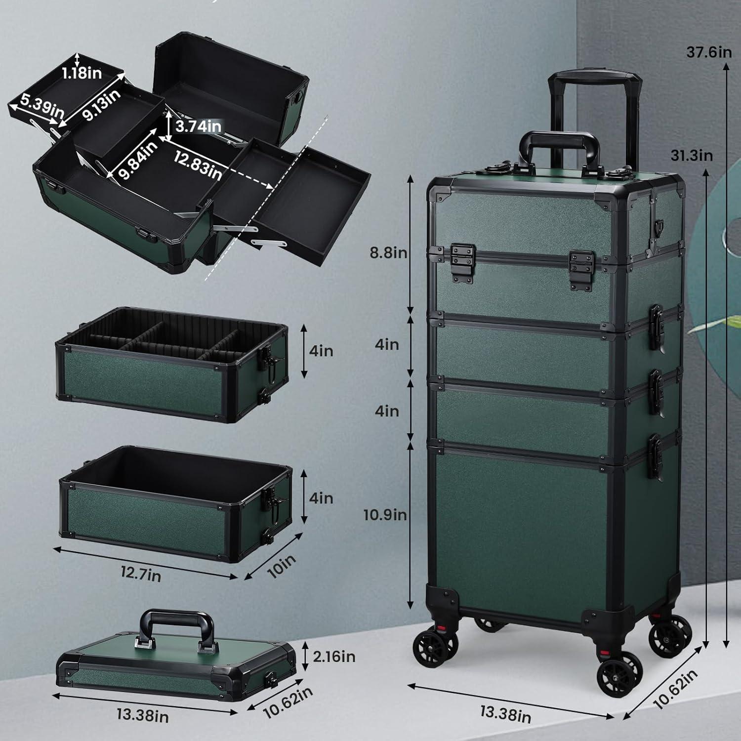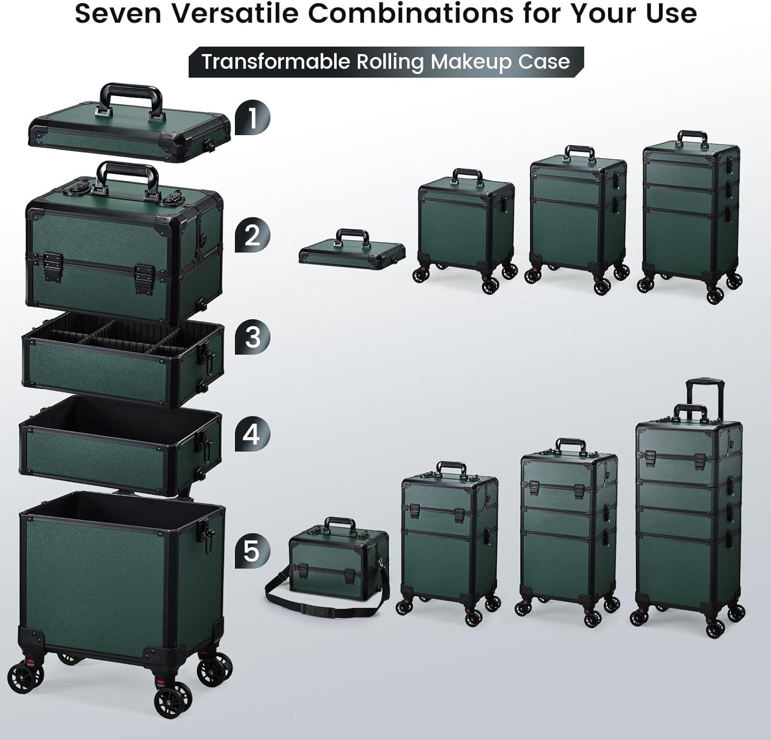 5-in-1 Makeup Rolling Case: This cleverly designed cosmetic rolling case is a versatile storage solution for professionals and individuals. It has four removable trays and a lid, allowing you to arrange it in seven different ways. You can combine all the parts for a complete 5-in-1 case, or separate them into 4-in-1, 3-in-1, or 2-in-1 configurations. This flexible design lets you customize the case to fit your specific needs and the amount of cosmetics you have. It's a convenient and adaptable storage option.