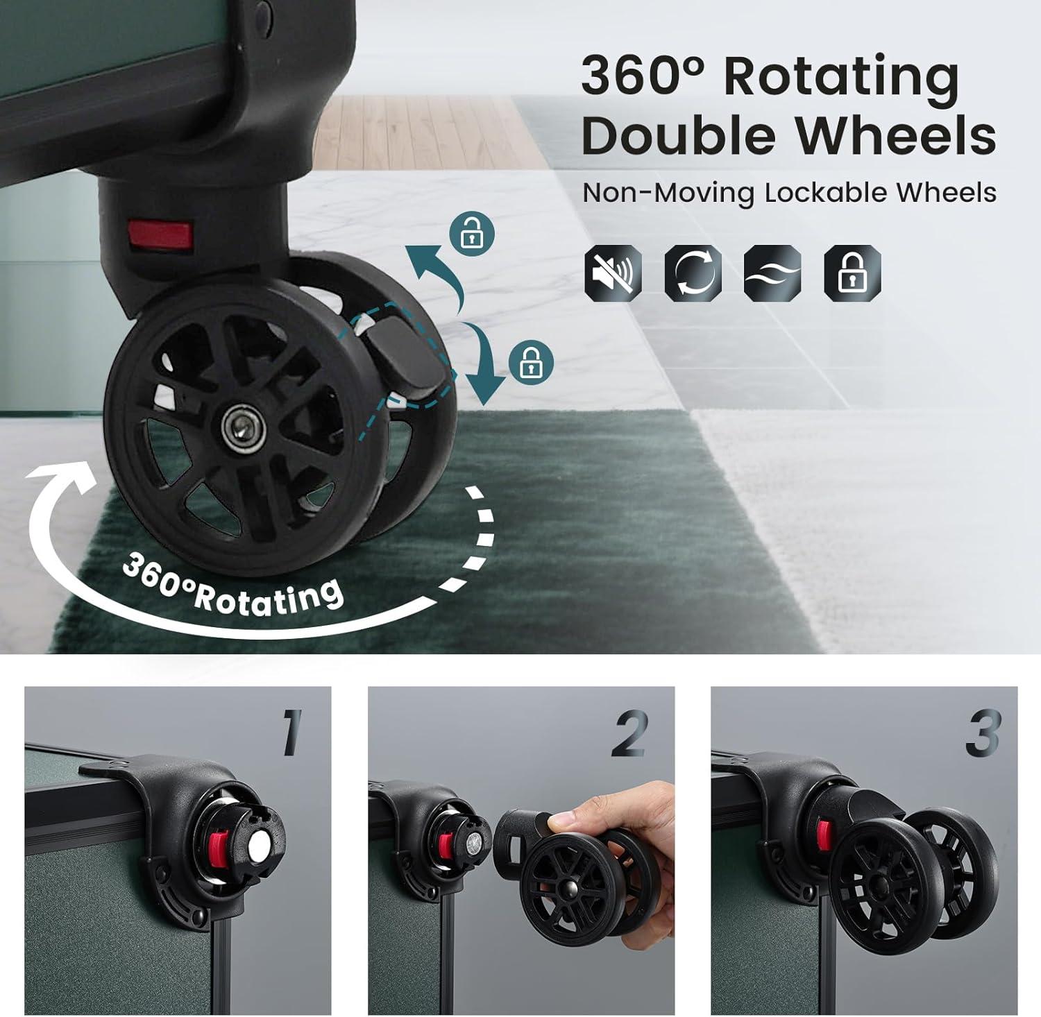 360-degree swivel wheels: This rolling suitcase has four high-quality wheels that spin 360 degrees. This makes it easy to move smoothly and quietly. The wheels glide easily, so you don't have to work hard to pull the case. You can also take the wheels off for easy replacement or when not needed. This makes the suitcase more versatile and lasts longer. Two of the wheels have brakes to keep the case from moving when you use it.